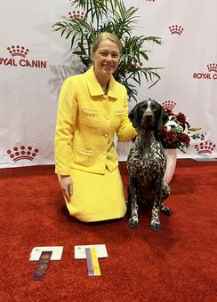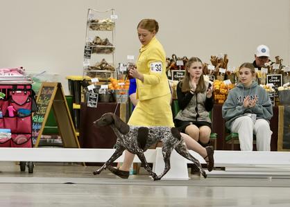 Belle was our pick from our 2022 "Movie Theme Song" litter out of Louie and Halle. The puppy names were Mickey Mouse Club House characters and Belle was Clarabelle. Our son wouldn't let us rename her so we shortened Clarabelle to Belle and chose to name her after Beauty and the Beast. She has lived up to her name and is a Beauty in the ring and a beast in the field. She quickly finished her championship, earning her last points going best of Breed over a huge specials entry in St. Paul, followed by two more best of breeds that same weekend giving her a great start towards her Grand Championship. She continued to win breed placings, specialty show placings, owner handled group placings, and even an OH Best in show and Reserve best in show before a year of age! She finished 2023 ranked #4 in the breed and all breed standings, and #2 owner handled. She has won multiple best in specialty shows, numerous owner handled best in shows, sporting groups and has many sporting groups placings. She shows great style, drive and ability in the field. Belle earned all 6 Master Hunter passes needed for her Master Hunt title in the Spring of 2024. She finished her CDX, RAE and RM titles in the summer of 2024 and is now recognized as a VCX with the GSPCA. Belle was in the top 5 breed and all breed standings for 2024 as well as the #1 owner-handled GSP! In 2025, she had a 4 month break for maternity leave, but still managed too stay in the top 10 for Breed and All breed statistics and ended 2025 as #3 owner handled.