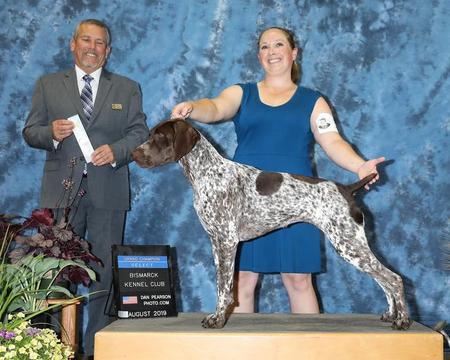 Birdie is an excellent example of the versatility of the GSP. She is a grand champion, breed winning, group placing, owner-handled group winning and placing exceptional bitch with the intelligence to carry over to the obedience and rally ring. Birdie currently has her Companion Dog title and Rally Advanced title and is training for towards her CDX title. She is an excellent bird dog and earned her Master Hunt Title in one season of testing in 2021. She is a calm and quiet, exceptionally lovable and affectionate girl.
