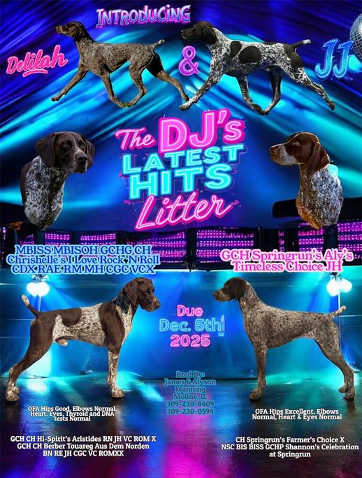 JJ has sired a litter in Moline, Illinois. This Pedigree brings together Chrishelle and Springrun lines once again, a similar cross as our Louie x Halle 2022 liter that produced our current star "Belle" and her brother "Charlie."